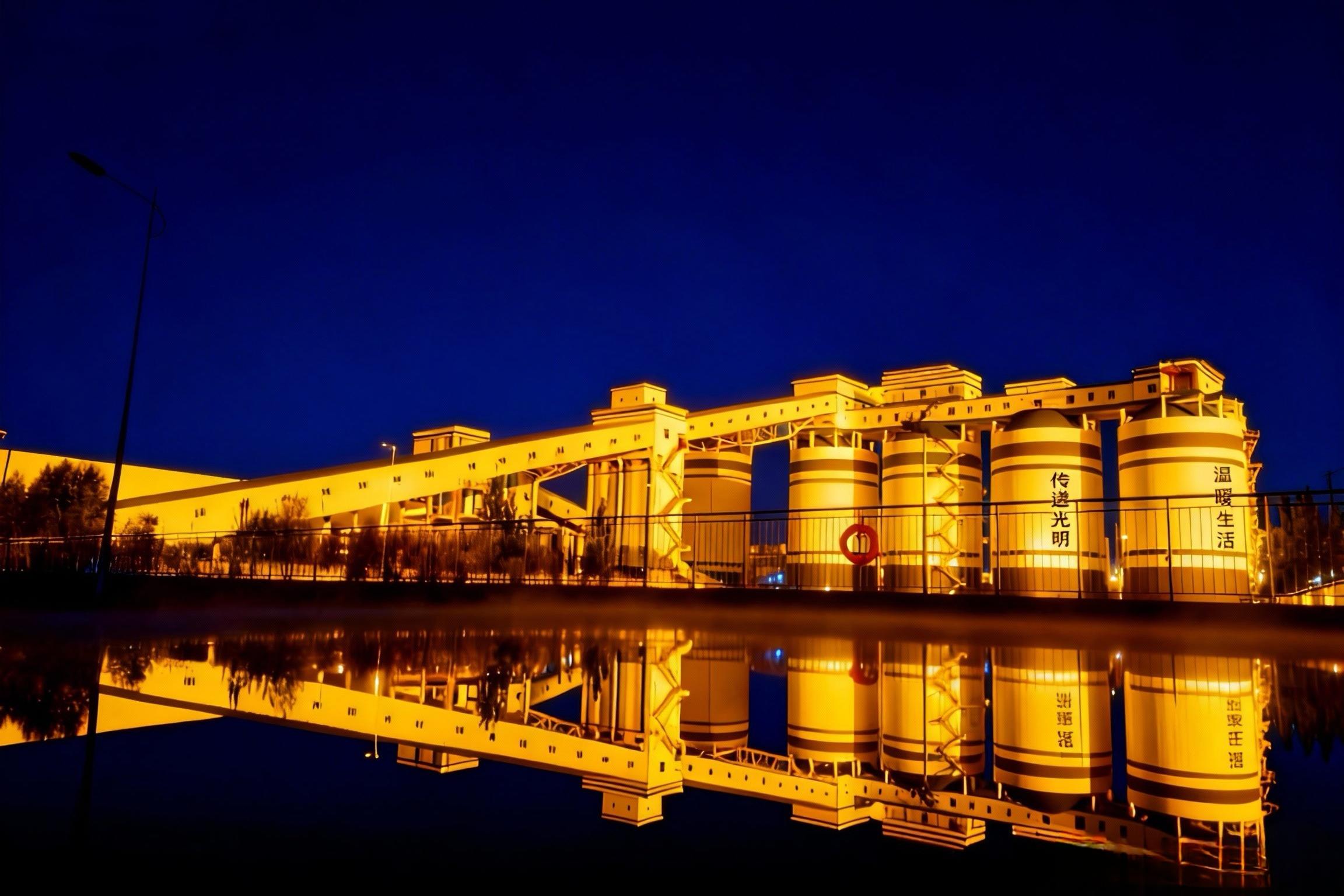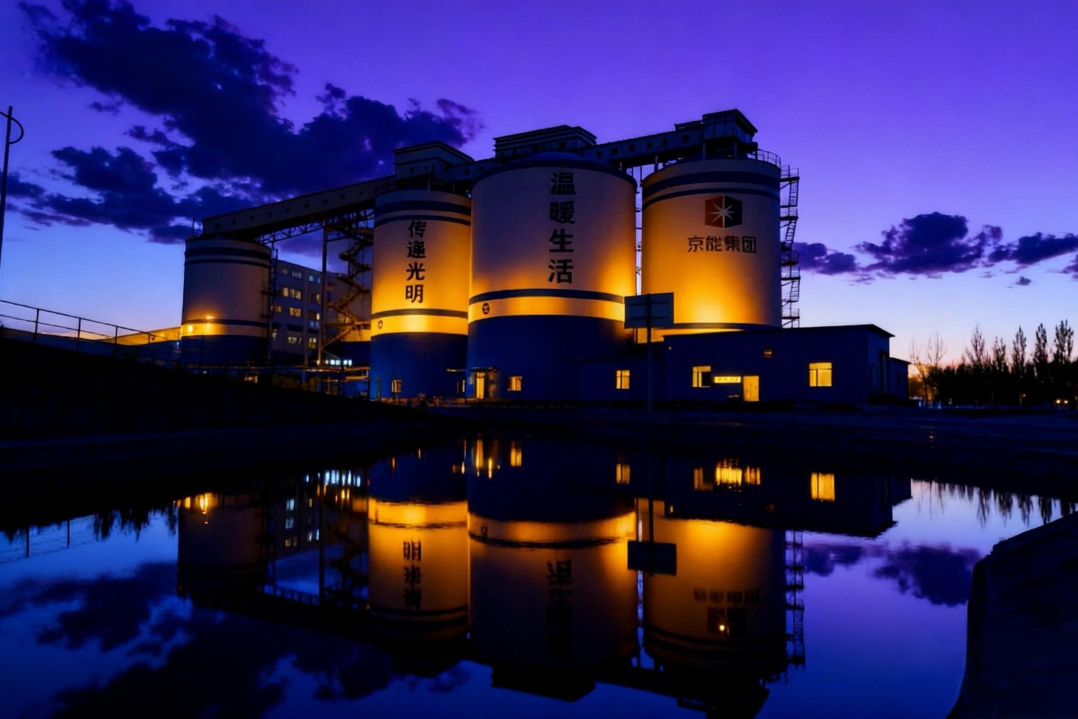 暮色四合,紫霞漫天,储煤仓在夜色中静静矗立,暖黄灯光勾勒出工业建筑的硬朗轮廓。前方生态池如一面明镜,将仓体、灯火与流云完整倒映,刚...